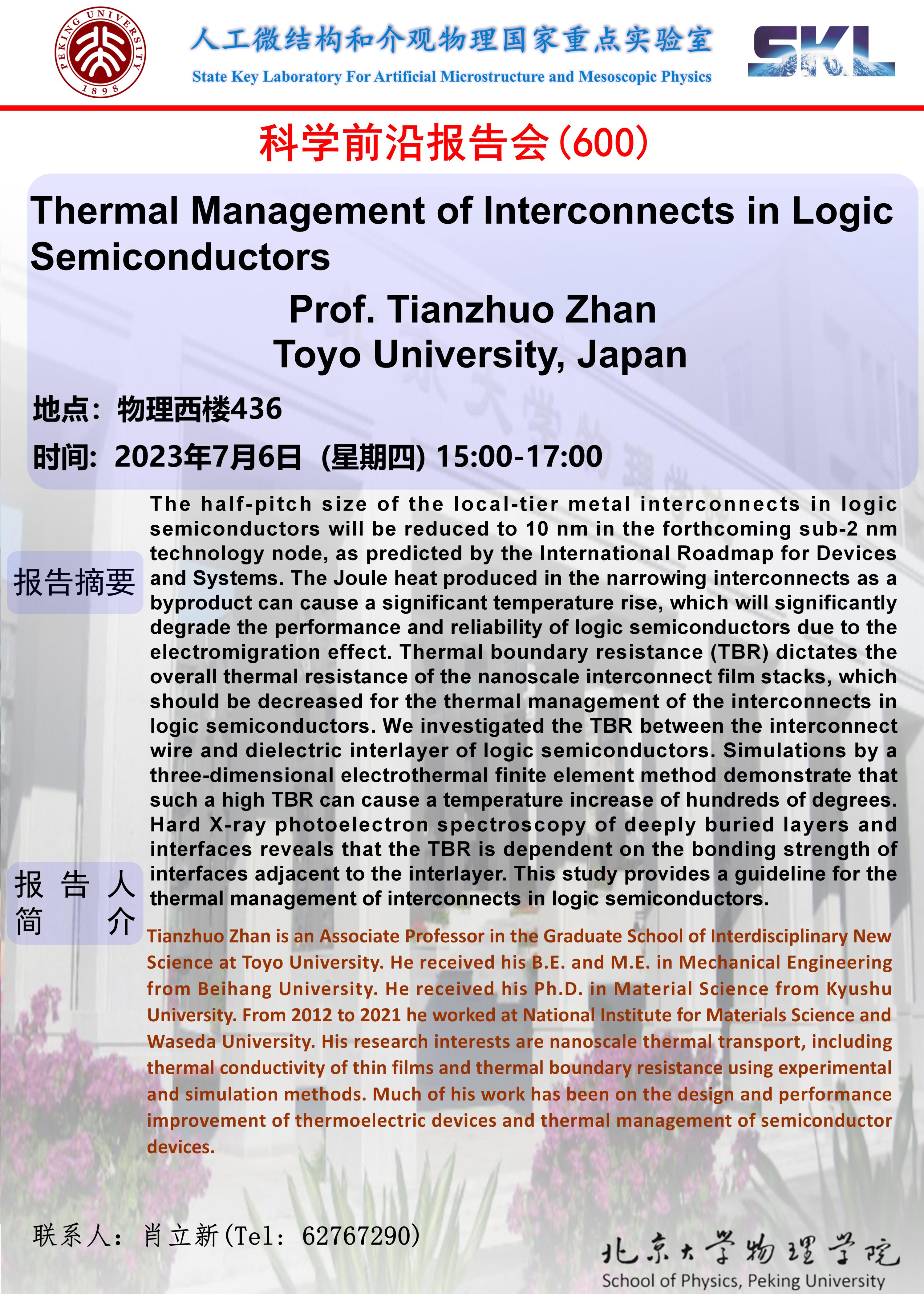 主讲人简介: Tianzhuo Zhan is an Associate Professor in the Graduate School of Interdisciplinary New Science at Toyo University. He received his B.E. and M.E. in Mechanical Engineering from Beihang University. He received his Ph.D. in Material Science from Kyushu University. From 2012 to 2021 he worked at National Institute for Materials Science and Waseda University. His research interests are nanoscale thermal transport, including thermal conductivity of thin films and thermal boundary resistance using experimental and simulation methods. Much of his work has been on the design and performance improvement of thermoelectric devices and thermal management of semiconductor devices.