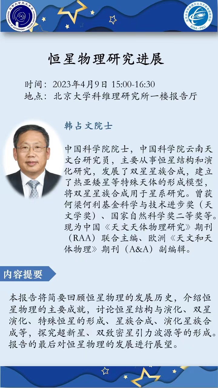 主讲人简介:韩占文,中国科学院院士,中国科学院云南天文台研究员,主要从事恒星结构和演化研究,发展了双星星族合成,建立了热亚矮星等特殊天体的形成模型,将双星星族合成用于星系研究。曾获何梁何利基金科学与技术进步奖(天文学奖)、国家自然科学奖二等奖等。现为中国《天文天体物理研究》期刊(RAA)联合主编、欧洲《天文和天体物理》期刊(A&A)副编辑。