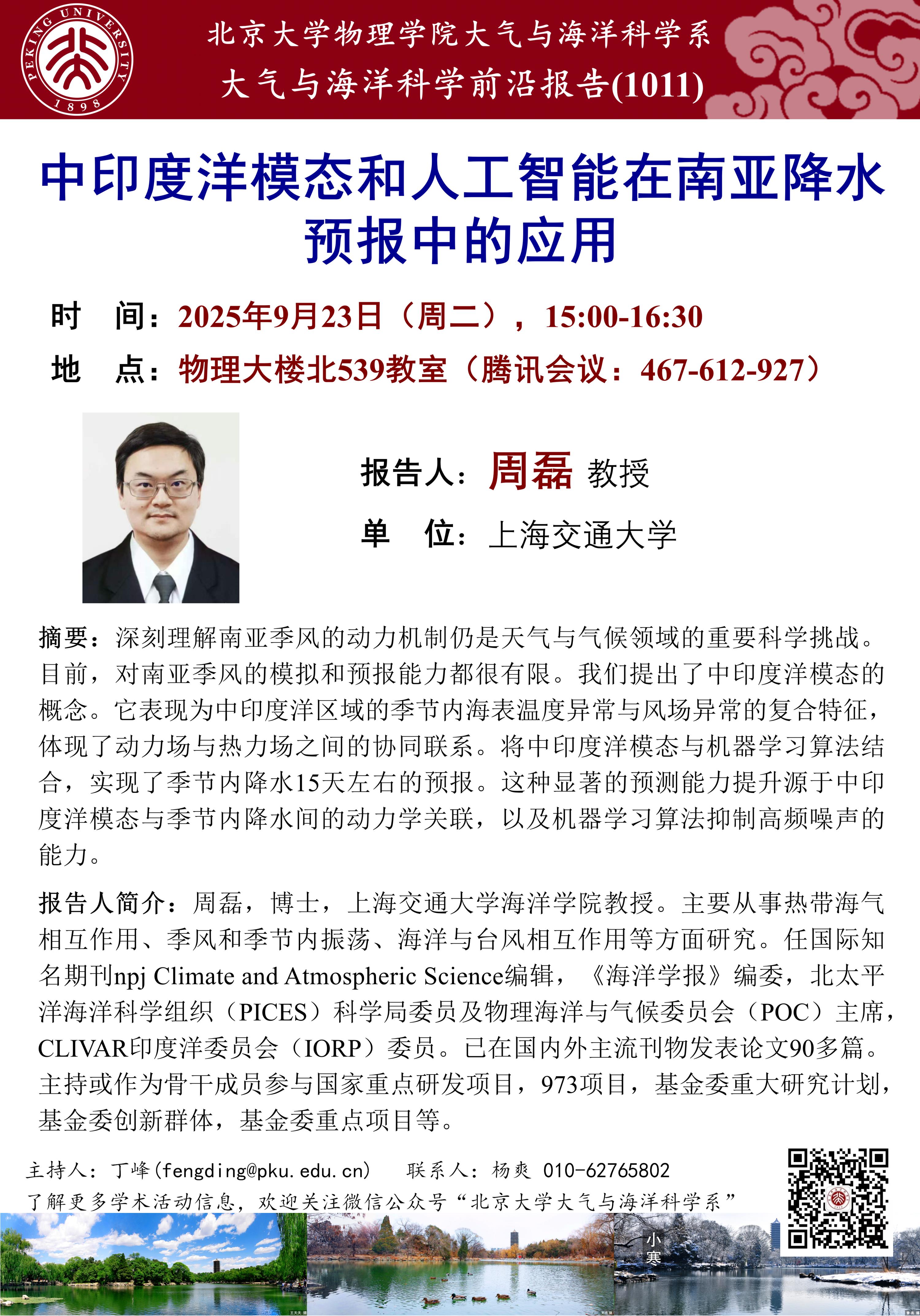 周磊,博士,上海交通大学海洋学院教授。主要从事热带海气相互作用、季风和季节内振荡、海洋与台风相互作用等方面研究。任国际知名期刊npj Climate and Atmospheric Science编辑,《海洋学报》编委,北太平洋海洋科学组织(PICES)科学局委员及物理海洋与气候委员会(POC)主席,CLIVAR印度洋委员会(IORP)委员。已在国内外主流刊物发表论文90多篇。主持或作为骨干成员参与国家重点研发项目,973项目,基金委重大研究计划,基金委创新群体,基金委重点项目等。