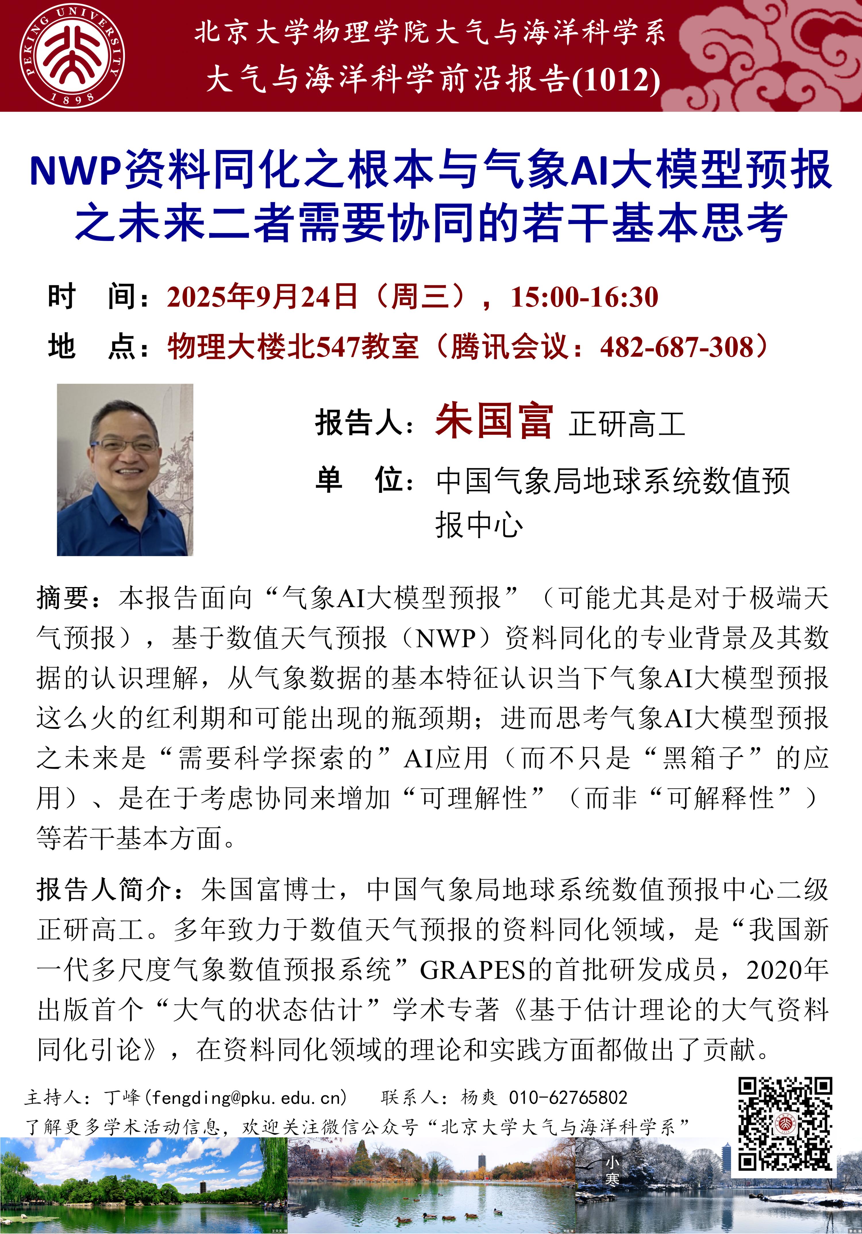 朱国富博士,中国气象局地球系统数值预报中心二级正研高工。多年致力于数值天气预报的资料同化领域,是“我国新一代多尺度气象数值预报系统”GRAPES的首批研发成员,2020年出版首个“大气的状态估计”学术专著《基于估计理论的大气资料同化引论》,在资料同化领域的理论和实践方面都做出了贡献。