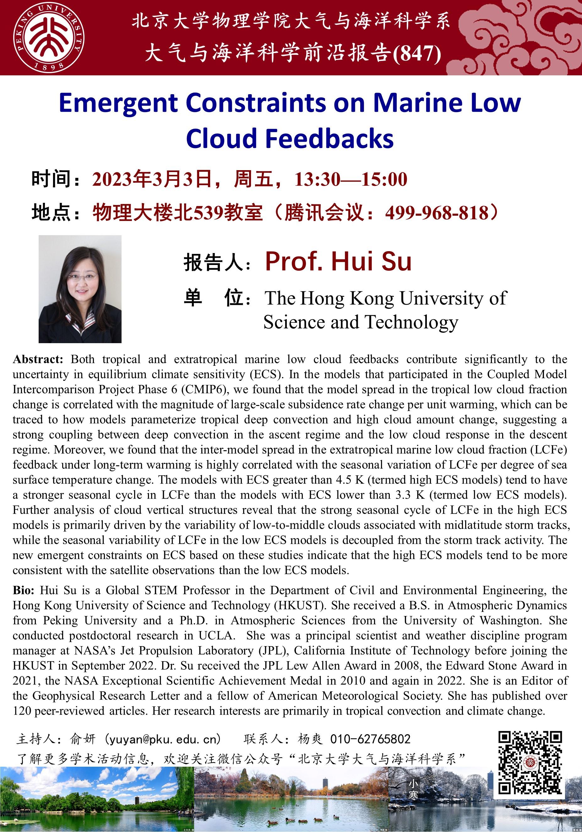 Hui Su is a Global STEM Professor in the Department of Civil and Environmental Engineering, the Hong Kong University of Science and Technology (HKUST). She received a B.S. in Atmospheric Dynamics from Peking University and a Ph.D. in Atmospheric Sciences from the University of Washington. She conducted postdoctoral research in UCLA. She was a principal scientist and weather discipline program manager at NASA’s Jet Propulsion Laboratory (JPL), California Institute of Technology before joining the HKUST in September 2022. Dr. Su received the JPL Lew Allen Award in 2008, the Edward Stone Award in 2021, the NASA Exceptional Scientific Achievement Medal in 2010 and again in 2022. She is an Editor of the Geophysical Research Letter and a fellow of American Meteorological Society. She has published over 120 peer-reviewed articles. Her research interests are primarily in tropical convection and climate change.