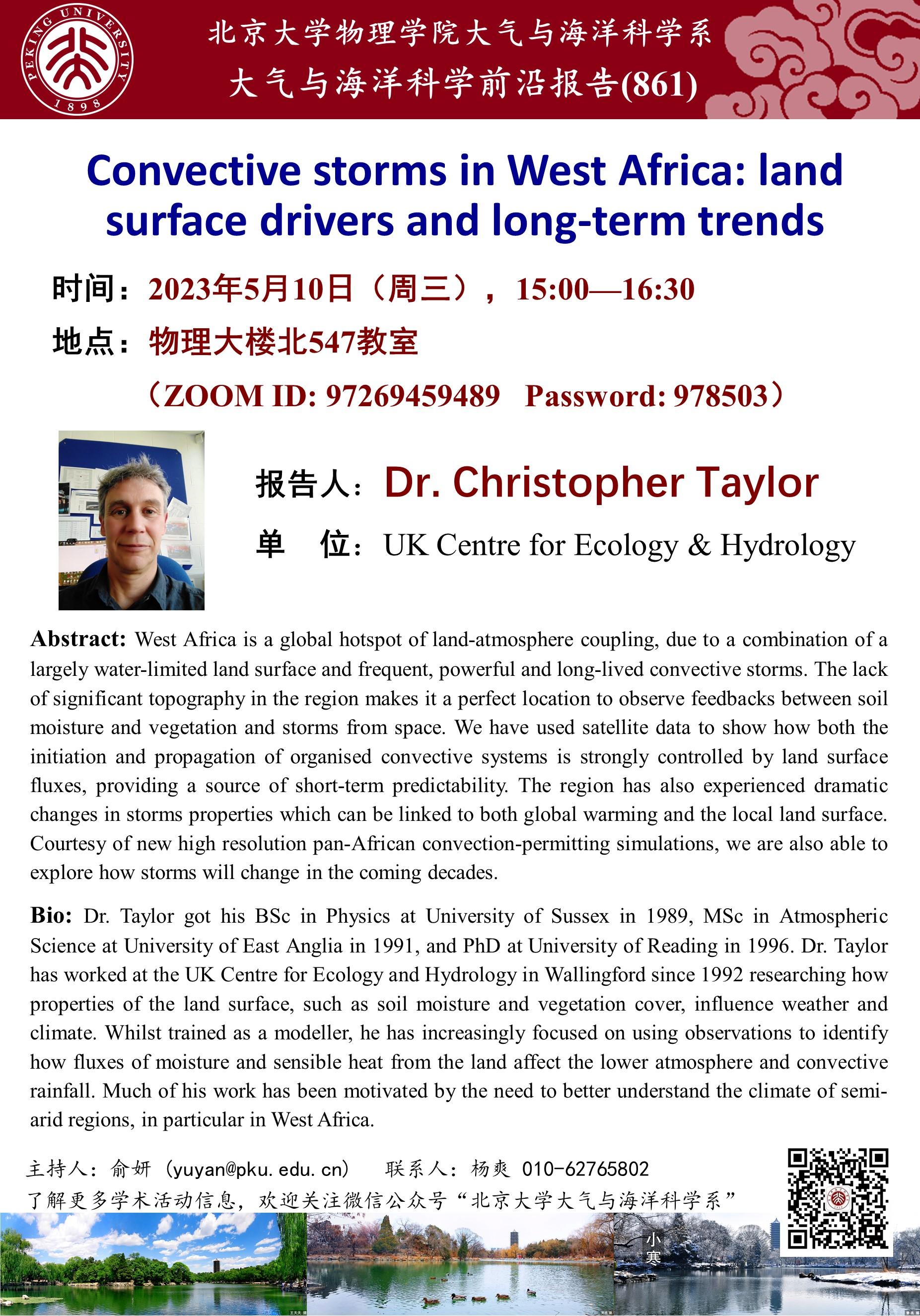 Dr. Taylor got his BSc in Physics at University of Sussex in 1989, MSc in Atmospheric Science at University of East Anglia in 1991, and PhD at University of Reading in 1996. Dr. Taylor has worked at the UK Centre for Ecology and Hydrology in Wallingford since 1992 researching how properties of the land surface, such as soil moisture and vegetation cover, influence weather and climate. Whilst trained as a modeller, he has increasingly focused on using observations to identify how fluxes of moisture and sensible heat from the land affect the lower atmosphere and convective rainfall. Much of his work has been motivated by the need to better understand the climate of semi-arid regions, in particular in West Africa.