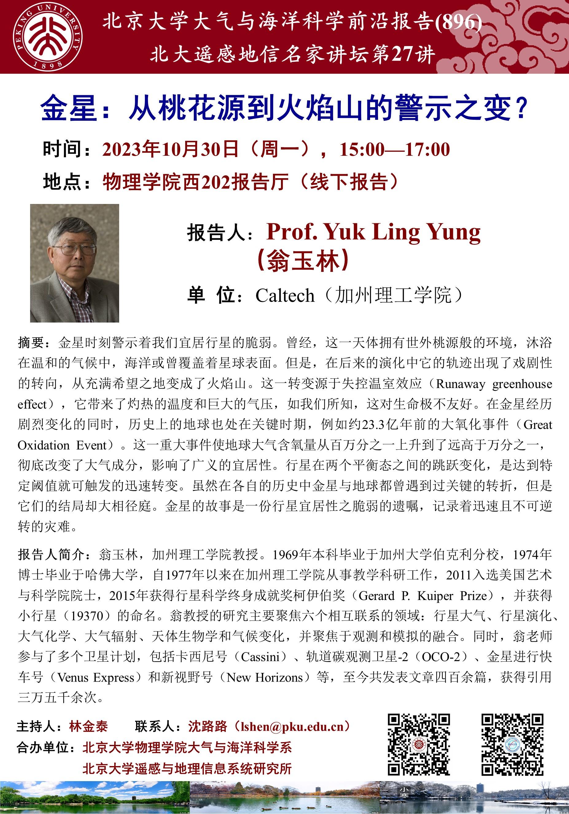 翁玉林,加州理工学院教授。1969年本科毕业于加州大学伯克利分校,1974年博士毕业于哈佛大学,自1977年以来在加州理工学院从事教学科研工作,2011入选美国艺术与科学院院士,2015年获得行星科学终身成就奖柯伊伯奖(Gerard P. Kuiper Prize),并获得小行星(19370)的命名。翁教授的研究主要聚焦六个相互联系的领域:行星大气、行星演化、大气化学、大气辐射、天体生物学和气候变化,并聚焦于观测和模拟的融合。同时,翁老师参与了多个卫星计划,包括卡西尼号(Cassini)、轨道碳观测卫星-2(OCO-2)、金星进行快车号(Venus Express)和新视野号(New Horizons)等,至今共发表文章四百余篇,获得引用三万五千余次。