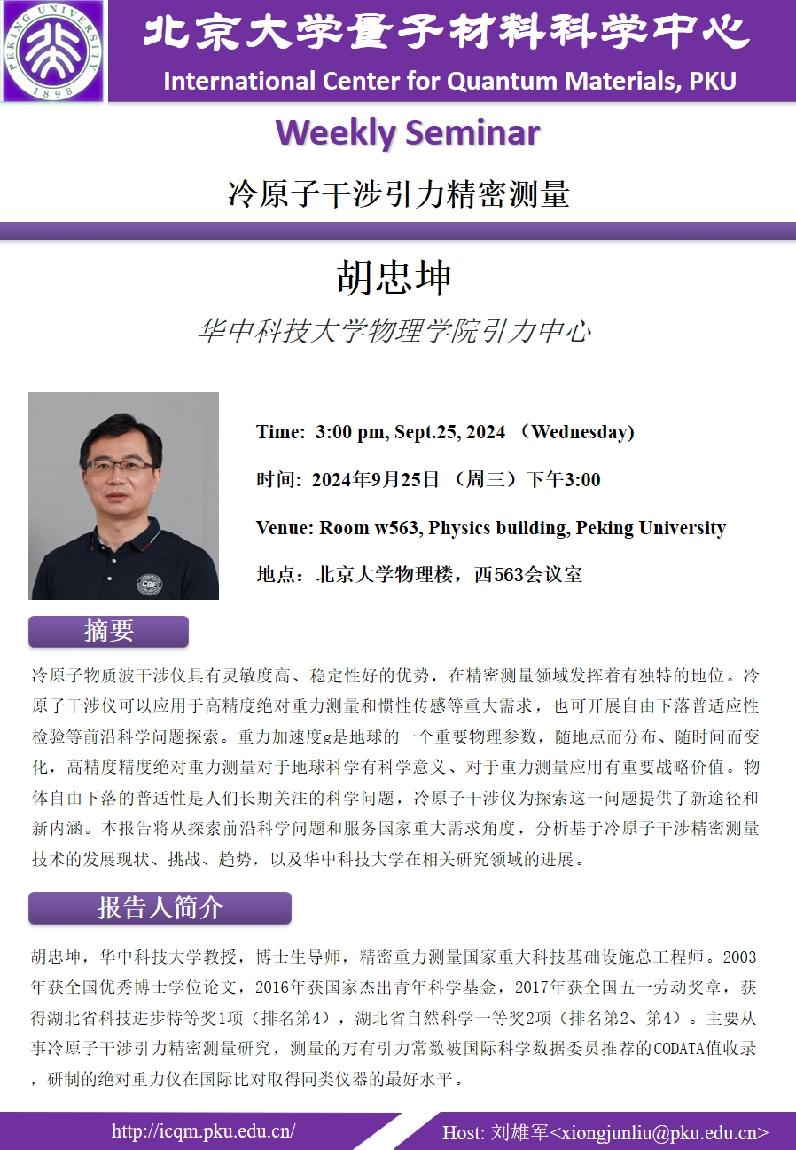 胡忠坤,华中科技大学教授,博士生导师,精密重力测量国家重大科技基础设施总工程师。2003年获全国优秀博士学位论文,2016年获国家杰出青年科学基金,2017年获全国五一劳动奖章,获得湖北省科技进步特等奖1项(排名第4),湖北省自然科学一等奖2项(排名第2、第4)。主要从事冷原子干涉引力精密测量研究,测量的万有引力常数被国际科学数据委员推荐的CODATA值收录,研制的绝对重力仪在国际比对取得同类仪器的最好水平。