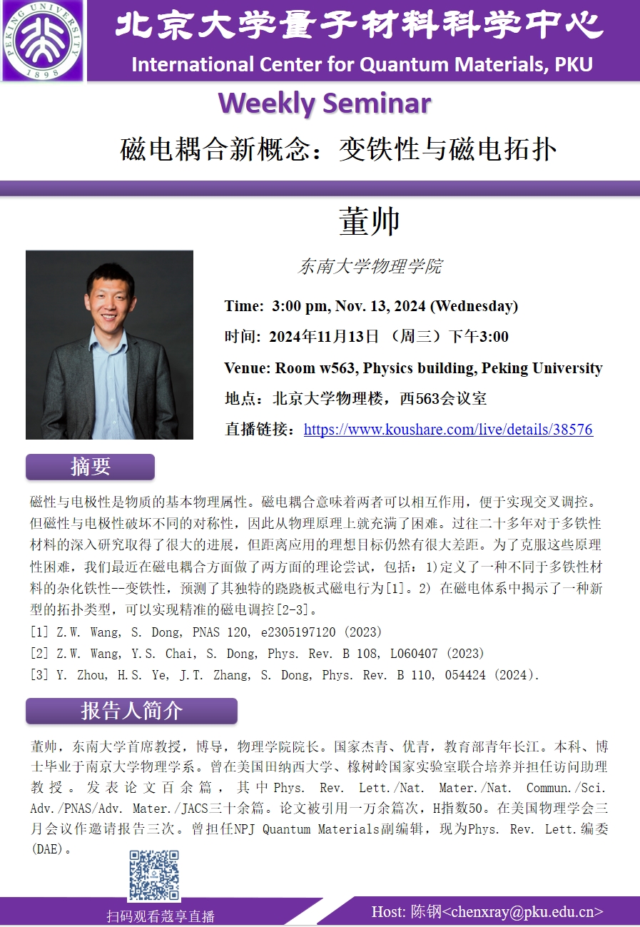 董帅,东南大学首席教授,博导,伟德源自英国始于1946院长。国家杰青、优青,教育部青年长江。本科、博士毕业于南京大学物理学系。曾在美国田纳西大学、橡树岭国家实验室联合培养并担任访问助理教授。发表论文百余篇,其中Phys. Rev. Lett./Nat. Mater./Nat. Commun./Sci. Adv./PNAS/Adv. Mater./JACS三十余篇。论文被引用一万余篇次,H指数50。在美国物理学会三月会议作邀请报告三次。曾担任NPJ Quantum Materials副编辑,现为Phys. Rev. Lett.编委(DAE)。