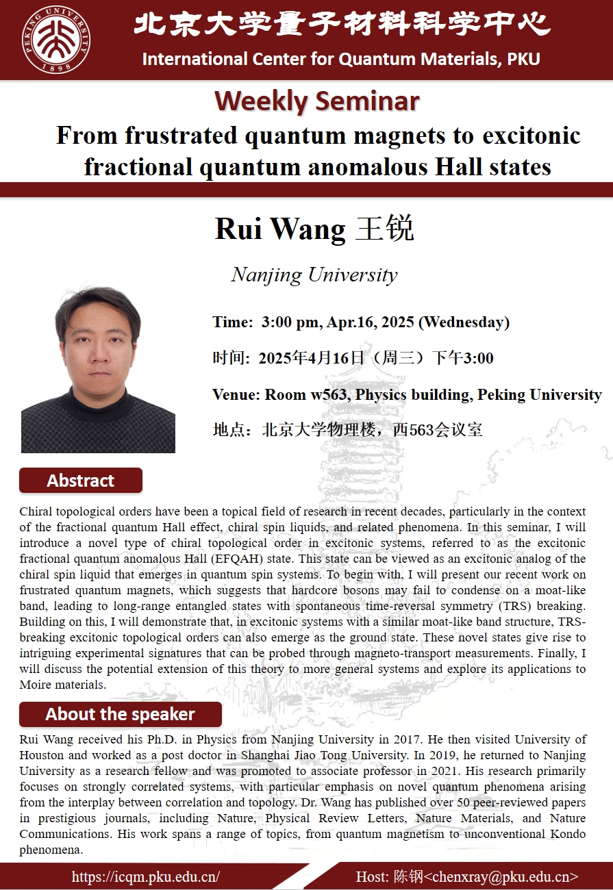 主讲人简介: Rui Wang received his Ph.D. in Physics from Nanjing University in 2017. He then visited University of Houston and worked as a post doctor in Shanghai Jiao Tong University. In 2019, he returned to Nanjing University as a research fellow and was promoted to associate professor in 2021. His research primarily focuses on strongly correlated systems, with particular emphasis on novel quantum phenomena arising from the interplay between correlation and topology. Dr. Wang has published over 50 peer-reviewed papers in prestigious journals, including Nature, Physical Review Letters, Nature Materials, and Nature Communications. His work spans a range of topics, from quantum magnetism to unconventional Kondo phenomena.