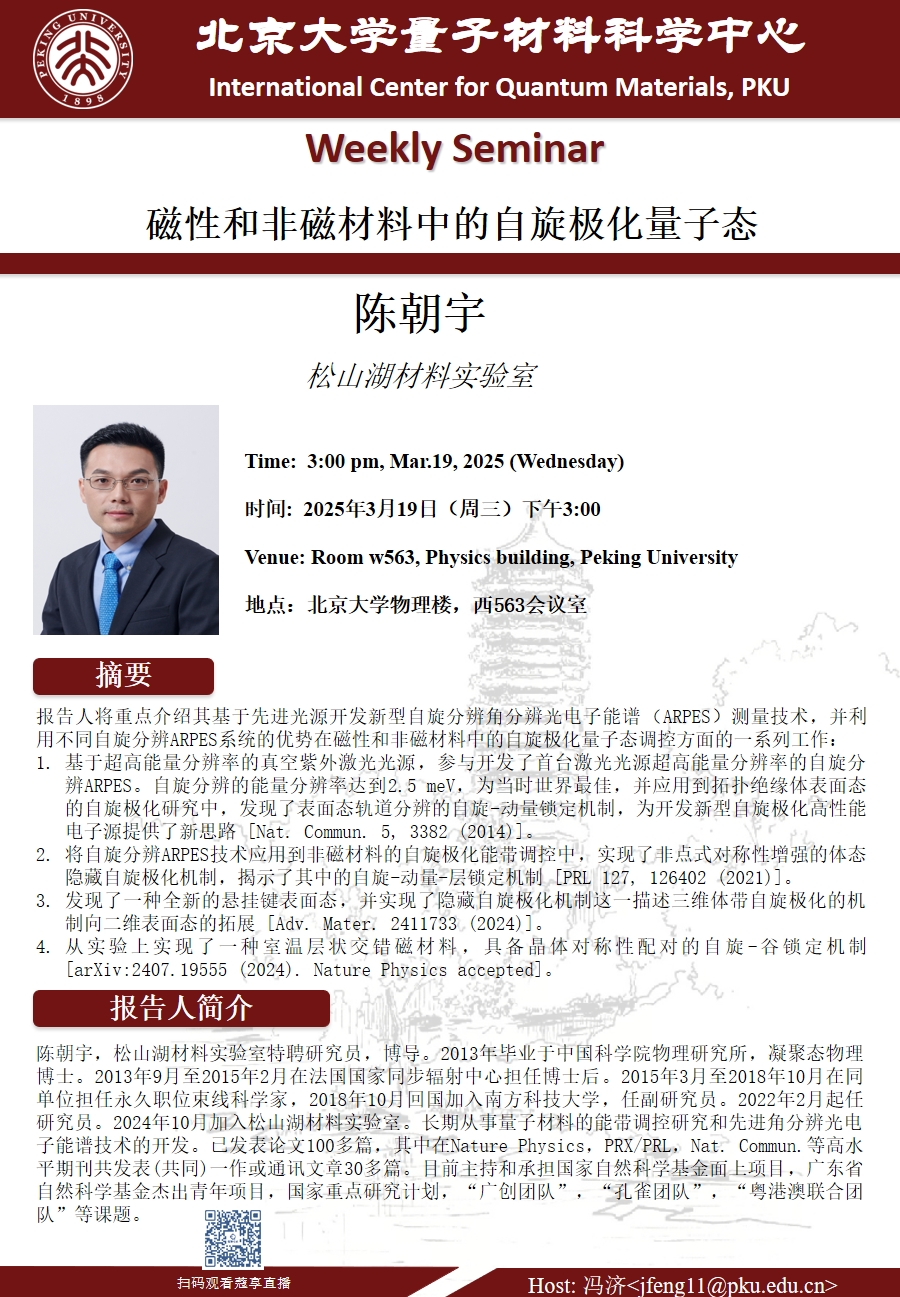 陈朝宇,松山湖材料实验室特聘研究员,博导。2013年毕业于中国科学院物理研究所,凝聚态物理博士。2013年9月至2015年2月在法国国家同步辐射中心担任博士后。2015年3月至2018年10月在同单位担任永久职位束线科学家,2018年10月回国加入南方科技大学,任副研究员。2022年2月起任研究员。2024年10月加入松山湖材料实验室。长期从事量子材料的能带调控研究和先进角分辨光电子能谱技术的开发。已发表论文100多篇,其中在Nature Physics,PRX/PRL,Nat. Commun.等高水平期刊共发表(共同)一作或通讯文章30多篇。目前主持和承担国家自然科学基金面上项目,广东省自然科学基金杰出青年项目,国家重点研究计划,“广创团队”,“孔雀团队”,“粤港澳联合团队”等课题。