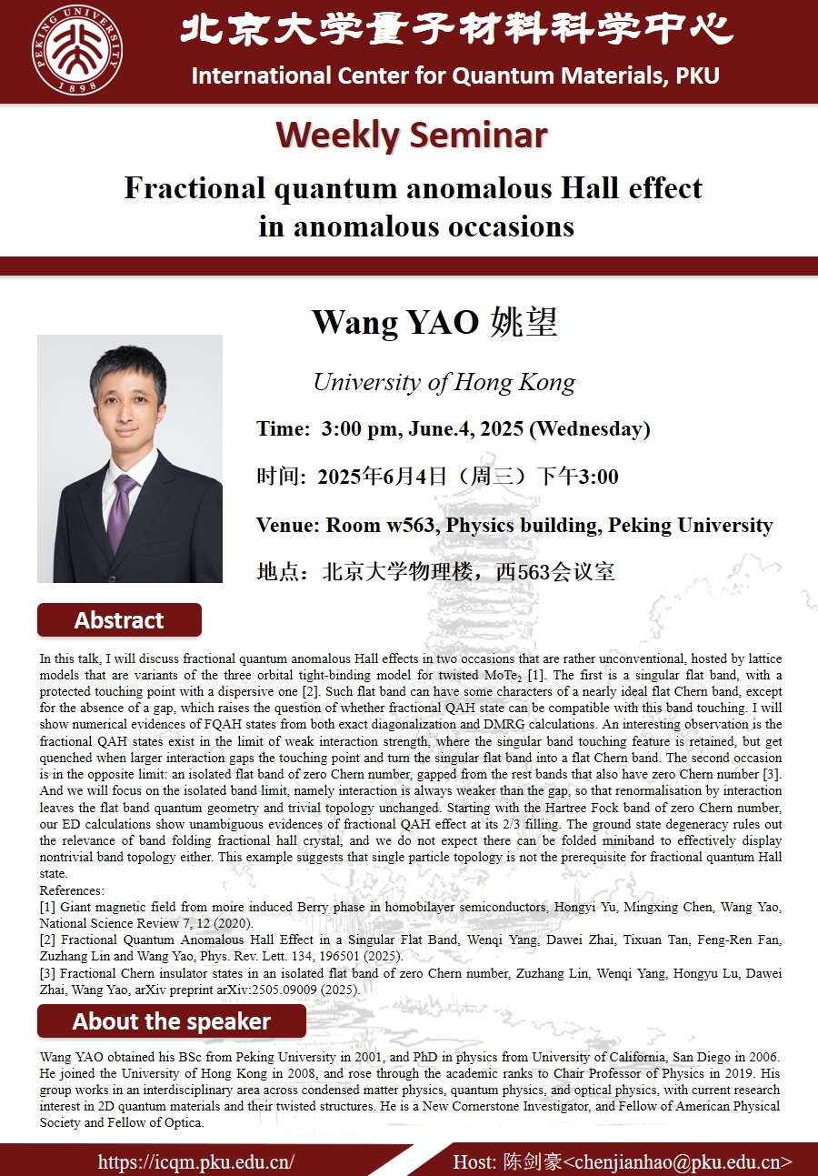 Wang YAO obtained his BSc from Peking University in 2001, and PhD in physics from University of California, San Diego in 2006. He joined the University of Hong Kong in 2008, and rose through the academic ranks to Chair Professor of Physics in 2019. His group works in an interdisciplinary area across condensed matter physics, quantum physics, and optical physics, with current research interest in 2D quantum materials and their twisted structures. He is a New Cornerstone Investigator, and Fellow of American Physical Society and Fellow of Optica.