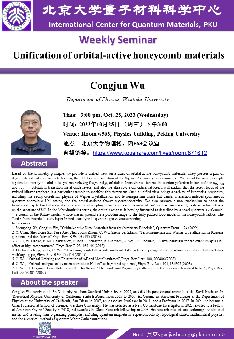 主讲人简介: Congjun Wu received his Ph.D. in physics from Stanford University in 2005, and did his postdoctoral research at the Kavli Institute for Theoretical Physics, University of California, Santa Barbara, from 2005 to 2007. He became an Assistant Professor in the Department of Physics at the University of California, San Diego in 2007, an Associate Professor in 2011, and a Professor in 2017. In 2021, he became a Chair Professor at School of Science, Westlake University.  He was selected as a New Cornerstone Investigator in 2023, elected to a Fellow of American Physical Society in 2018, and awarded the Sloan Research fellowship in 2008. His research interests are exploring new states of matter and reveling their organizing principles, including quantum magnetism, superconductivity, topological states, mathematical physics, and the numerical method of quantum Monte Carlo simulations.