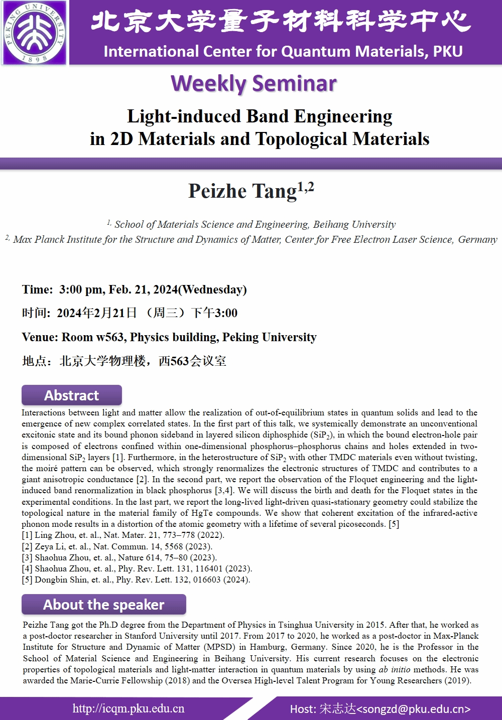 主讲人简介: Peizhe Tang got the Ph.D degree from the Department of Physics in Tsinghua University in 2015. After that, he worked as a post-doctor researcher in Stanford University until 2017. From 2017 to 2020, he worked as a post-doctor in Max-Planck Institute for Structure and Dynamic of Matter (MPSD) in Hamburg, Germany. Since 2020, he is the Professor in the School of Material Science and Engineering in Beihang University. His current research focuses on the electronic properties of topological materials and light-matter interaction in quantum materials by using ab initio methods. He was awarded the Marie-Currie Fellowship (2018) and the Oversea High-level Talent Program for Young Researchers (2019).