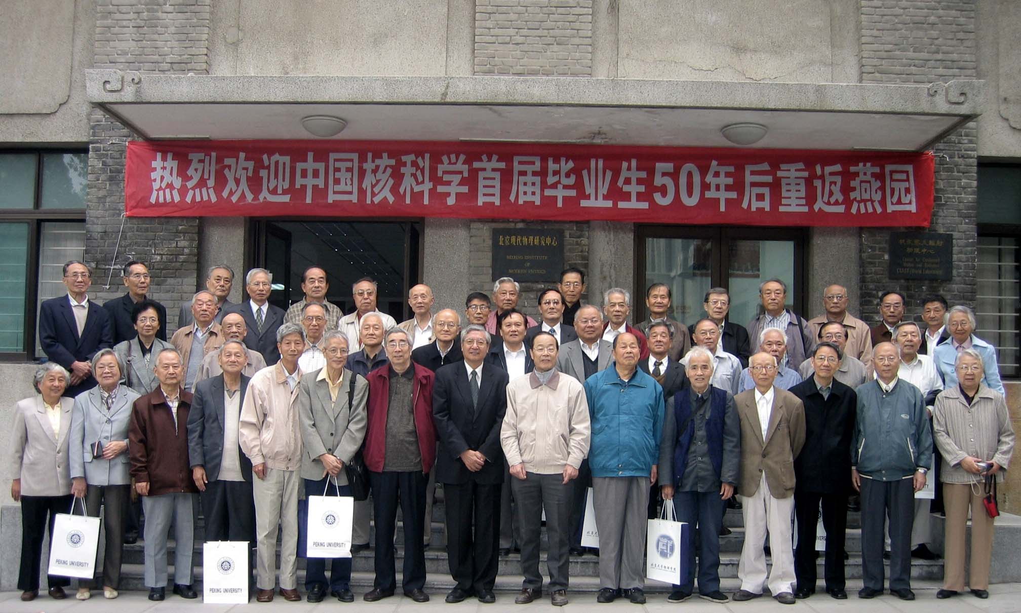 北大物理研究室第一届毕业生50年后重返燕园合影。前排左7周海婴、左8许智宏校长 |