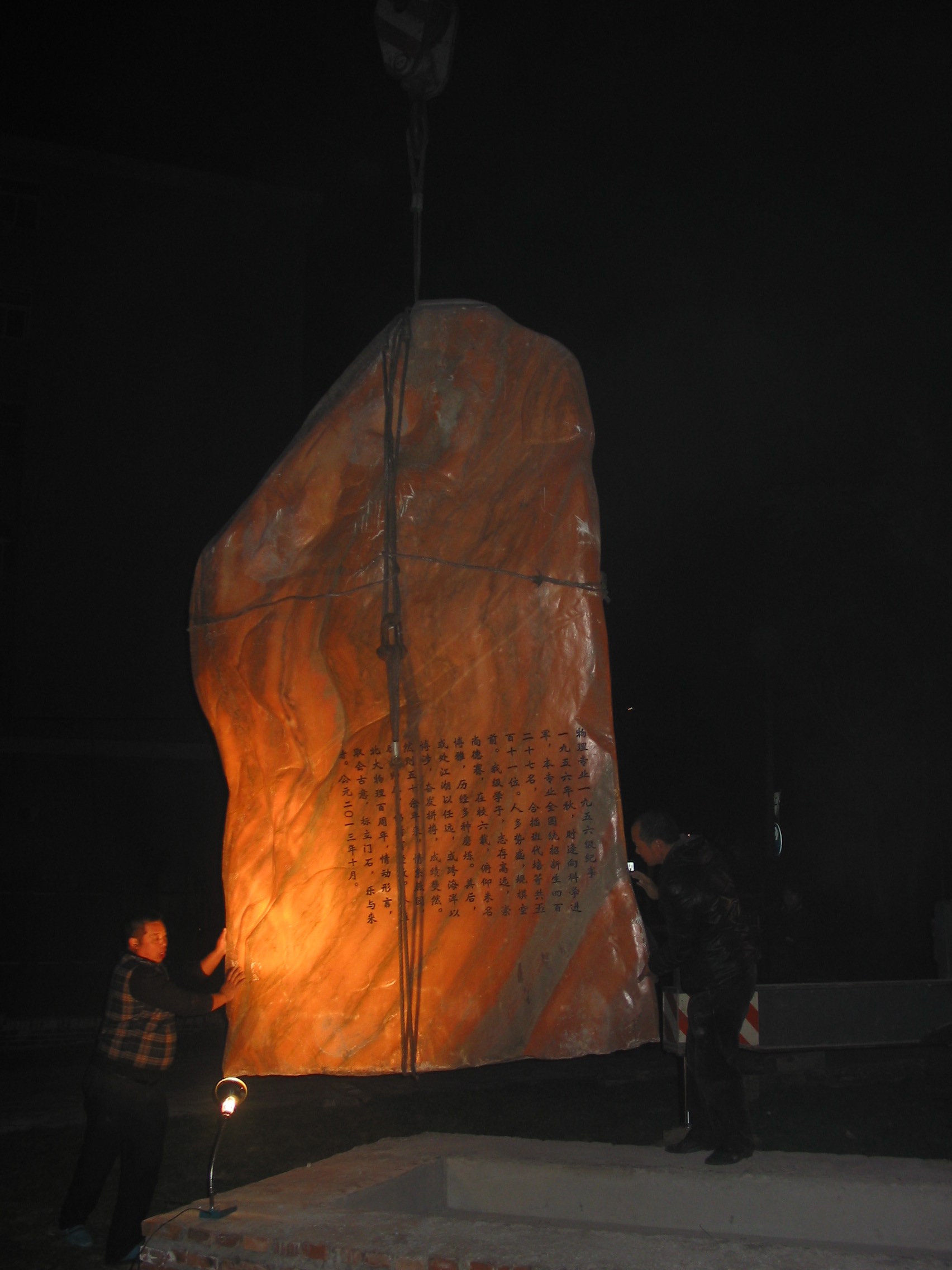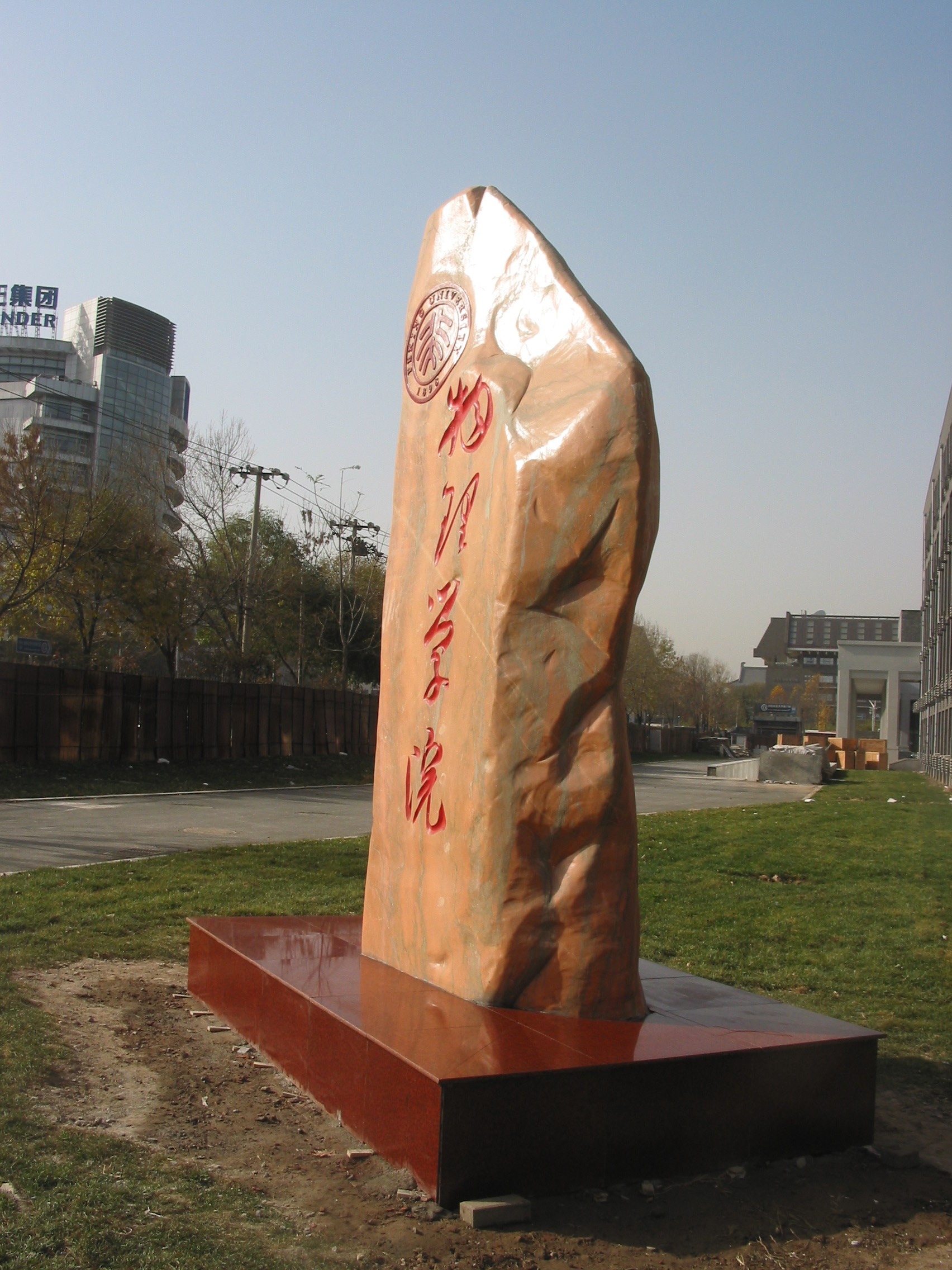 随后我们在北京房山景观石材厂找到一种名为“朝阳红玉”的石头,呈浅暗红色,夹以一些黑色条纹,很是好看。“朝阳红玉”属于花岗岩类的石头,比重和花岗岩相同或稍高;其硬度和材质又接近于玉石,所以有人称它为比较差的玉石;其耐腐蚀性好于花岗岩,寿命可达200年。我们选了横卧和直立两块石头,拍了照片,于2011年11月份,拿到筹委会上讨论。大家肯定了“朝阳红玉”的材质,考虑到物理大楼楼外的场地狭小,大型横卧门石不太合适;对所选直立的石头过于瘦小也不甚满意。于是我们马上在网上收索,发现河南信阳的“晚霞红”石材和“朝阳红玉”极为相似。深入了解后知道,二者是一回事。河南信阳是“朝阳红玉”的原产地*。一块高4米、宽2米、厚0.9米、重约13吨的石头落入我们的视野。它粗壮挺拔、曲线优美、浅暗红底中镶嵌着几条黑绿色的条纹…..。正面大体平整的部位正好可以刻“伟德源自英国始于1946”四字,刀削般的左侧面适于竖刻School