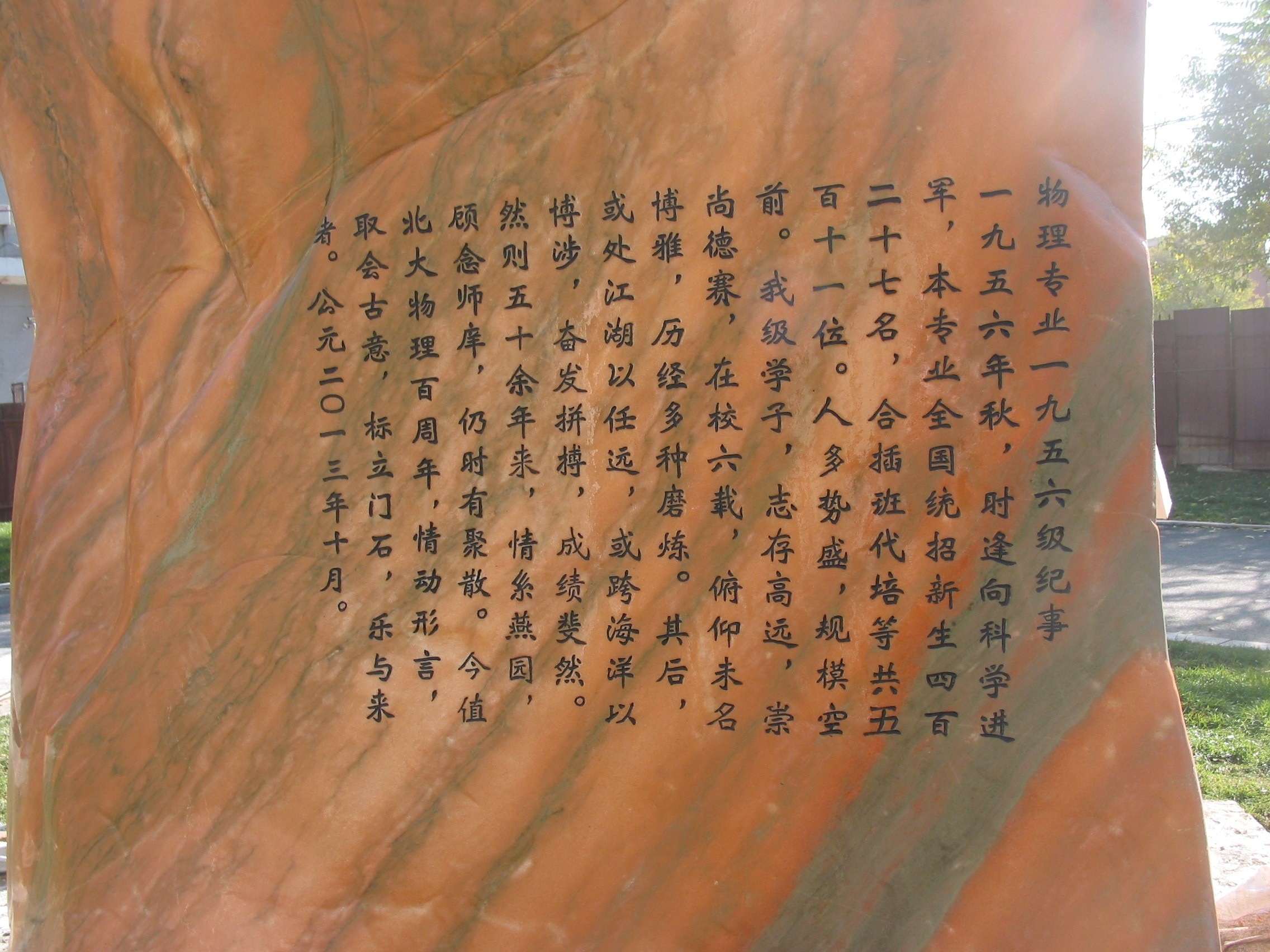 背面则仿照中国景观石文化的惯例,用时下的简体汉字刻上了56级纪事,共15竖行、192字。勾勒出我们与物理系结缘五十七年来的历史轨迹和轮廓。这里由于字数限制,力求涵蓄概括。字斟句琢,不文不白。但寓意良多,例如“崇尚德赛”的“德”指“民主”,“赛”指“科学”;“顾念师庠”的“庠”意为“学校”;最后一个“乐”字冀望于来者,表明标立门石的本意。相信同代学人看后,会浮想联翩,激动不已;后来者读后,会追寻历史,坚定立志,续写北大物理第二个百年…..。