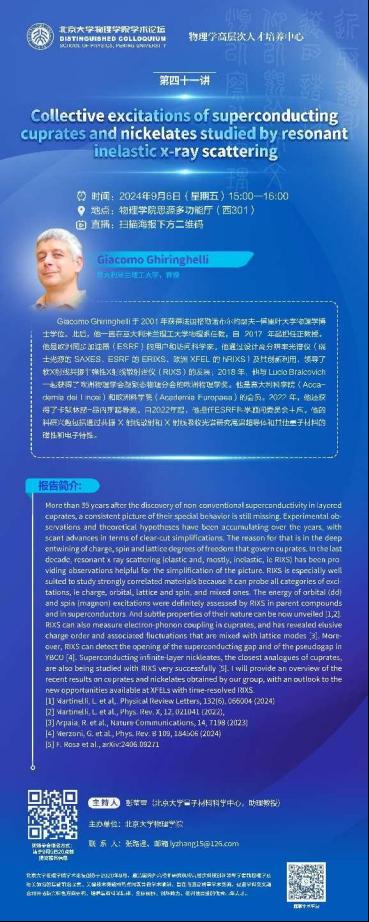 Giacomo Ghiringhelli于2001年获得法国格勒诺布尔约瑟夫-傅里叶大学物理学博士学位。此后,他一直在意大利米兰理工大学物理系任教,自2017年起担任正教授。他是欧洲同步加速器(ESRF)的用户和访问科学家。他通过设计高分辨率光谱仪(瑞士光源的SAXES、ESRF的ERIXS、欧洲XFEL的hRIXS)及其创新利用,领导了软X射线共振非弹性X射线散射谱仪(RIXS)的发展;2018年,他与Lucio Braicovich一起获得了欧洲物理学会凝聚态物理分会的欧洲物理学奖。他是意大利科学院(Accademia dei Lincei)和欧洲科学院(Academia Europaea)的会员。2022年,他还获得了卡默林赫-昂内斯超导奖。自2022年起,他担任ESRF科学顾问委员会主席。他的科研兴趣包括通过共振X射线散射和X射线吸收光谱研究高温超导体和其他量子材料的磁性和电子特性。