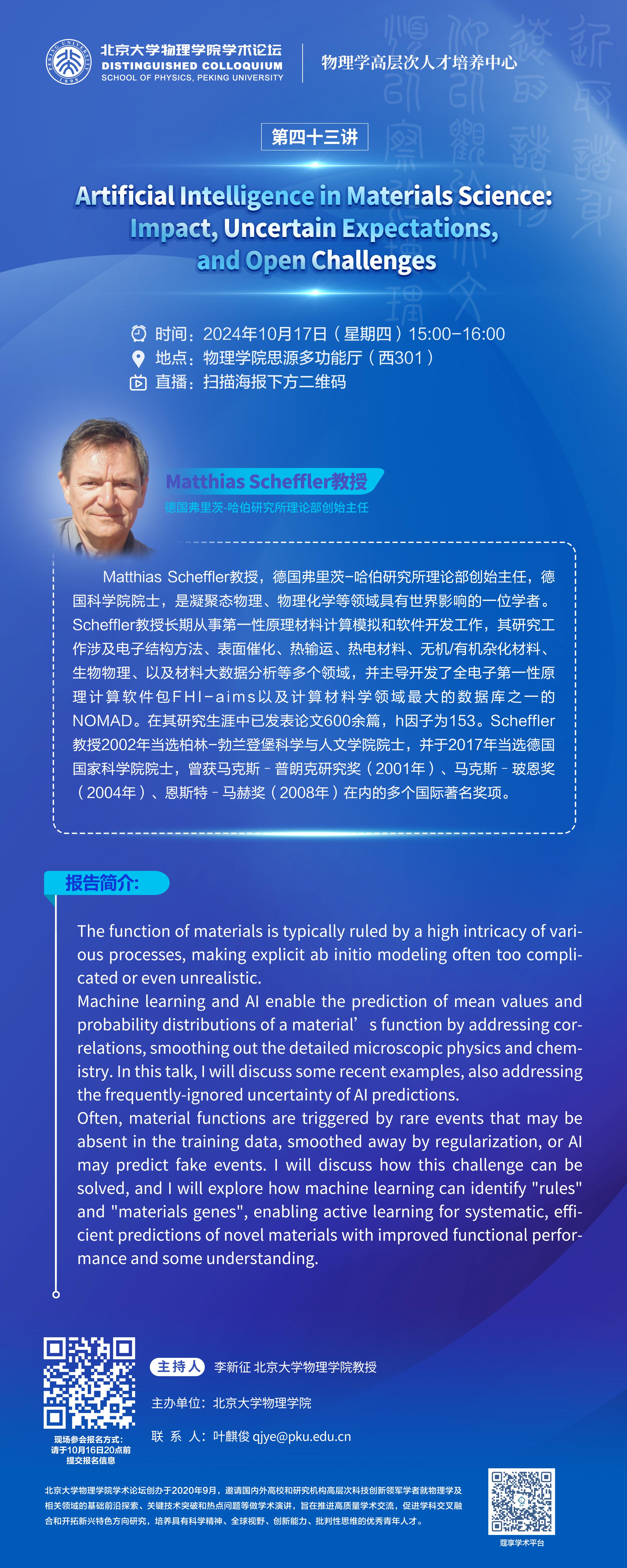 Matthias Scheffler教授,德国弗里茨-哈伯研究所理论部创始主任,德国科学院院士,是凝聚态物理、物理化学等领域具有世界影响的一位学者。Scheffler教授长期从事第一性原理材料计算模拟和软件开发工作,其研究工作涉及电子结构方法、表面催化、热输运、热电材料、无机/有机杂化材料、生物物理、以及材料大数据分析等多个领域,并主导开发了全电子第一性原理计算软件包FHI-aims以及计算材料学领域最大的数据库之一的NOMAD。在其研究生涯中已发表论文600余篇,h因子为153。Scheffler教授2002年当选柏林-勃兰登堡科学与人文学院院士,并于2017年当选德国国家科学院院士,曾获马克斯–普朗克研究奖(2001年)、马克斯–玻恩奖(2004年)、恩斯特–马赫奖(2008年)在内的多个国际著名奖项。