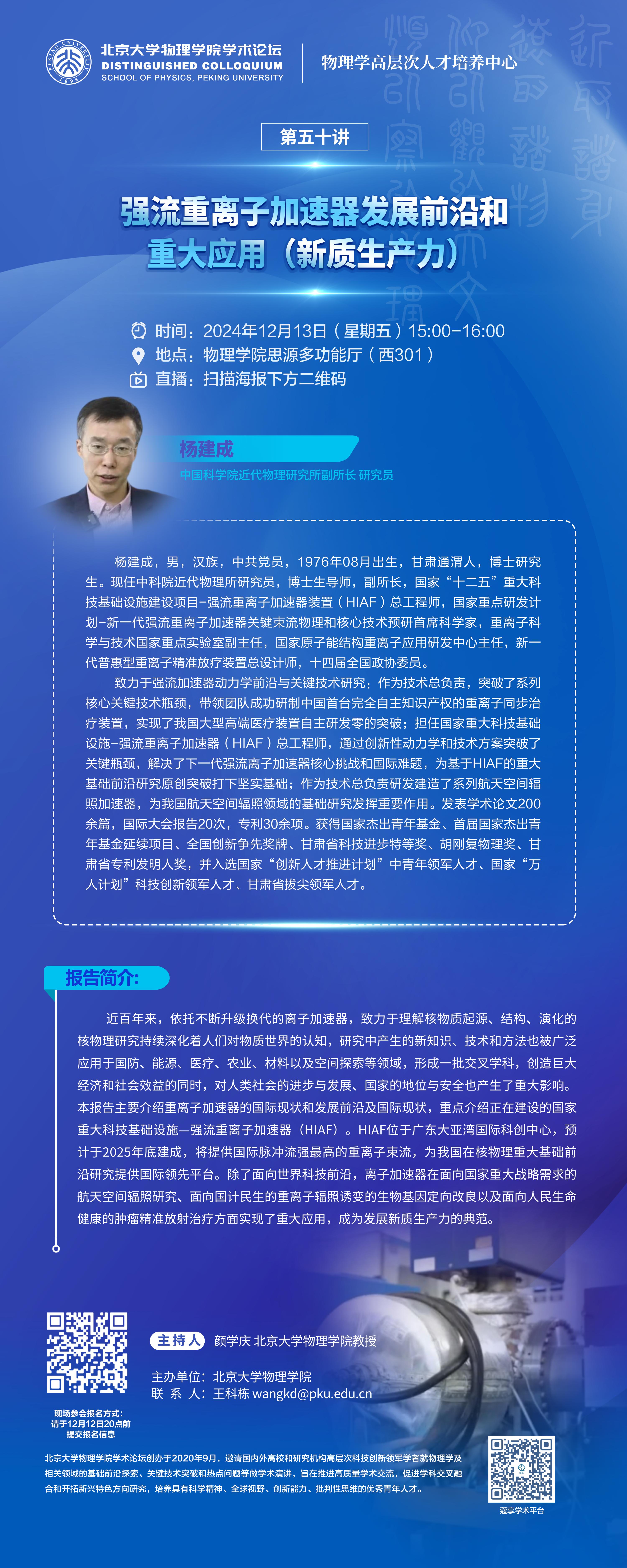 近百年来,依托不断升级换代的离子加速器,致力于理解核物质起源、结构、演化的核物理研究持续深化着人们对物质世界的认知,研究中产生的新知识、技术和方法也被广泛应用于国防、能源、医疗、农业、材料以及空间探索等领域,形成一批交叉学科,创造巨大经济和社会效益的同时,对人类社会的进步与发展、国家的地位与安全也产生了重大影响。本报告主要介绍重离子加速器的国际现状和发展前沿及国际现状,重点介绍正在建设的国家重大科技基础设施—强流重离子加速器(HIAF)。HIAF位于广东大亚湾国际科创中心,预计于2025年底建成,将提供国际脉冲流强最高的重离子束流,为我国在核物理重大基础前沿研究提供国际领先平台。除了面向世界科技前沿,离子加速器在面向国家重大战略需求的航天空间辐照研究、面向国计民生的重离子辐照诱变的生物基因定向改良以及面向人民生命健康的肿瘤精准放射治疗方面实现了重大应用,成为发展新质生产力的典范。