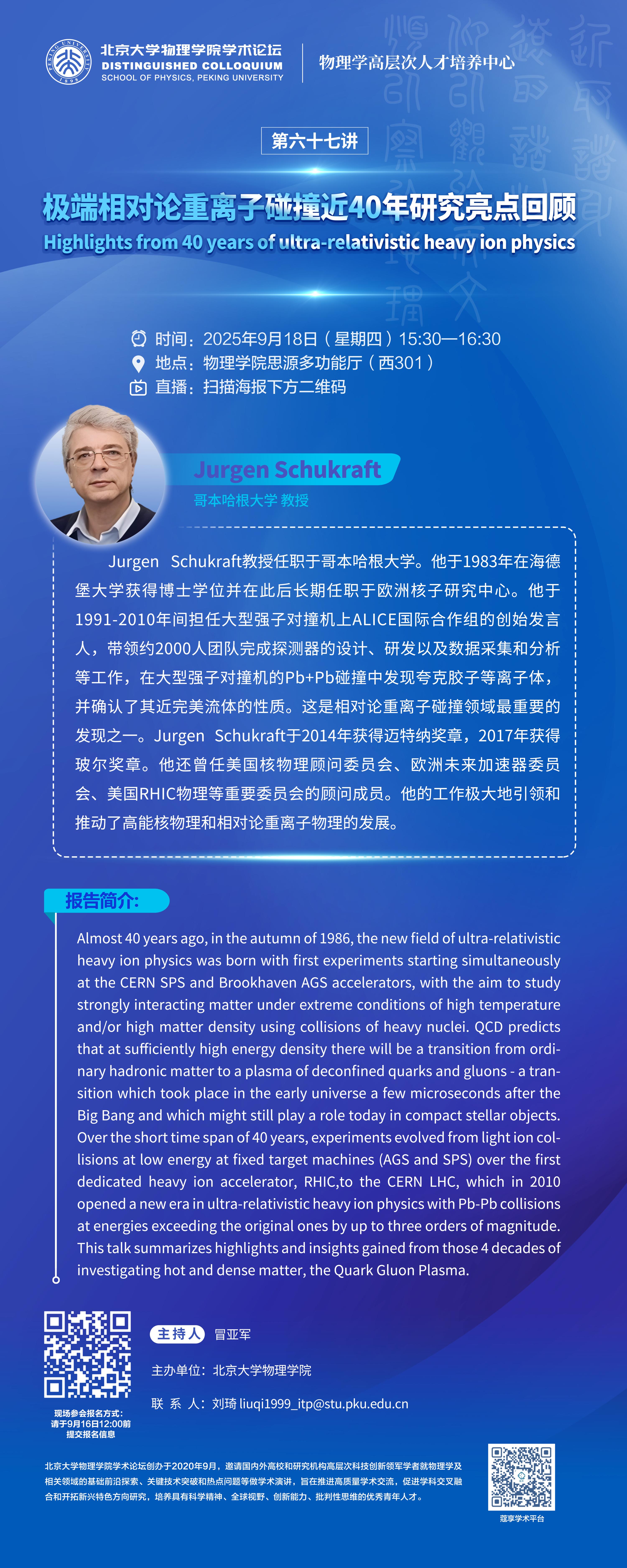 Jurgen Schukraft教授任职于哥本哈根大学。他于1983年在海德堡大学获得博士学位并在此后长期任职于欧洲核子研究中心。他于1991-2010年间担任大型强子对撞机上ALICE国际合作组的创始发言人,带领约2000人团队完成探测器的设计、研发以及数据采集和分析等工作,在大型强子对撞机的Pb+Pb碰撞中发现夸克胶子等离子体,并确认了其近完美流体的性质。这是相对论重离子碰撞领域最重要的发现之一。Jurgen Schukraft于2014年获得迈特纳奖章,2017年获得玻尔奖章。他还曾任美国核物理顾问委员会、欧洲未来加速器委员会、美国RHIC物理等重要委员会的顾问成员。他的工作极大地引领和推动了高能核物理和相对论重离子物理的发展。
