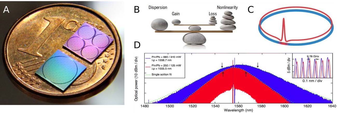 Figure Dissipative Kerr solitons in microresonators. (A) Photograph of Si3N4 photonic chips on 1-cent Euro coin. (B) Principle of a DKS that balances dispersion and nonlinearity, as well as parametric gain and cavity loss. (C) Temporal dissipative soliton waveform envelope in a microresonator. (D) Optical spectra of single-DKS states with 9.78 GHz repetition rates (in the X-band).