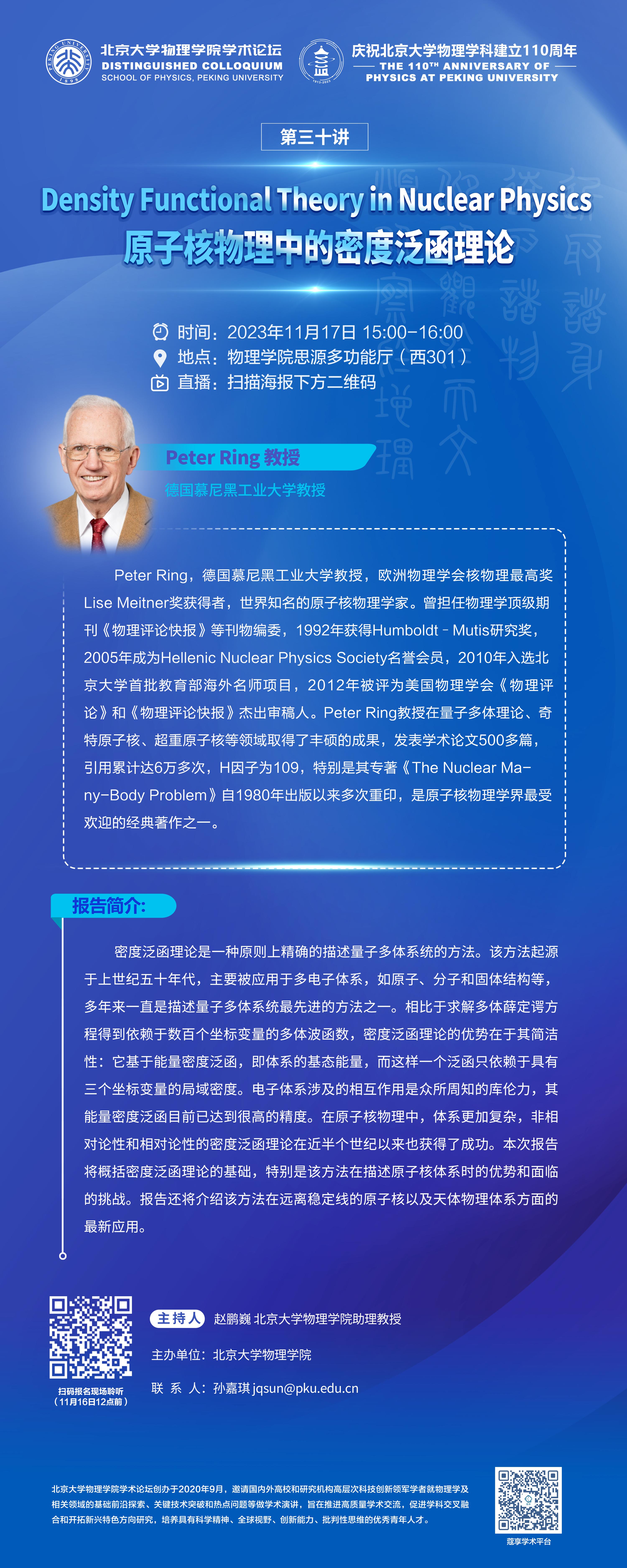 Peter Ring,德国慕尼黑工业大学教授,欧洲物理学会核物理最高奖Lise Meitner奖获得者,世界知名的原子核物理学家。曾担任物理学顶级期刊《物理评论快报》等刊物编委,1992年获得Humboldt–Mutis研究奖,2005年成为Hellenic Nuclear Physics Society名誉会员,2010年入选伟德源自英国始于1946首批教育部海外名师项目,2012年被评为美国物理学会《物理评论》和《物理评论快报》杰出审稿人。Peter Ring教授在量子多体理论、奇特原子核、超重原子核等领域取得了丰硕的成果,发表学术论文500多篇,引用累计达6万多次,H因子为109,特别是其专著《The Nuclear Many-Body Problem》自1980年出版以来多次重印,是原子核物理学界最受欢迎的经典著作之一。