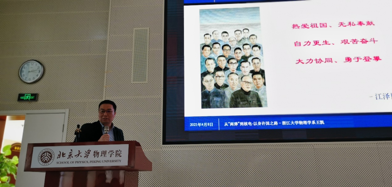 本次报告会邀请到浙江大学物理学系教授、副系主任王凯作报告。王凯老师是《中国科学-物理力学天文》期刊编委,长期从事粒子物理理论研究,发表论文四十余篇引用近两千次,主讲浙江大学校级课程思政示范课《工程物理导论》,获浙江大学优秀共产党员、浙江大学党校优秀教师等称号。王老师为同学们带来题为《从“两弹”到核电-“以身许国”之路》的报告。王老师指出在中国共产党的领导下,我国成功在六十年代实现了原子弹、氢弹的突破,彻底打破了帝国主义的“核讹诈”,奠定了今天我国作为核大国的国际地位。王老师从王淦昌、邓稼先等几位老一辈科学家面对民族被压迫立志“科学救国”的故事开始,围绕“救国”和“科学”两条主线,讲述我国核武器研制历史,以及核武器和核反应堆等基本物理原理。然后王老师从我国和法国氢弹研制路径对比、前苏联切尔诺贝利核事故等具体案例,阐明只有打下扎实学术基础,真正做到“知其然知其所以然”,才是解决当前面临的众多关键核心技术突破的关键。王老师希望同学们能够传承先辈们“科学救国”的精神,在当下树立“科学强国”的信念,深入研究,不断创新,为中华民族的伟大复兴贡献力量。