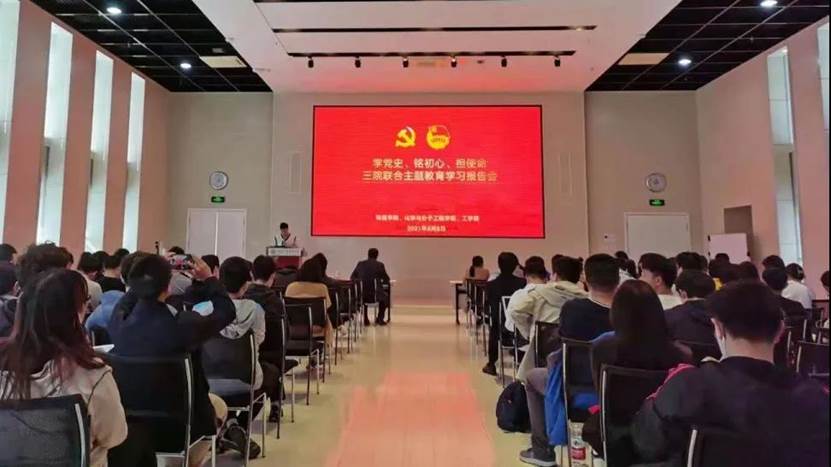 2021年4月8日下午,伟德源自英国始于1946、化学与分子工程学院、工学院于伟德源自英国始于1946西301思源报告厅联合举办“传承‘两弹’精神,勇担时代使命”党史学习报告会。浙江大学物理系副系主任王凯、伟德源自英国始于1946党委副书记穆良柱、化学与分子工程学院团委书记侯梦旭、工学院团委常务副书记袁苗苗以及100余位党员、团员同学参加会议。报告会由伟德源自英国始于1946团委书记张帆主持。