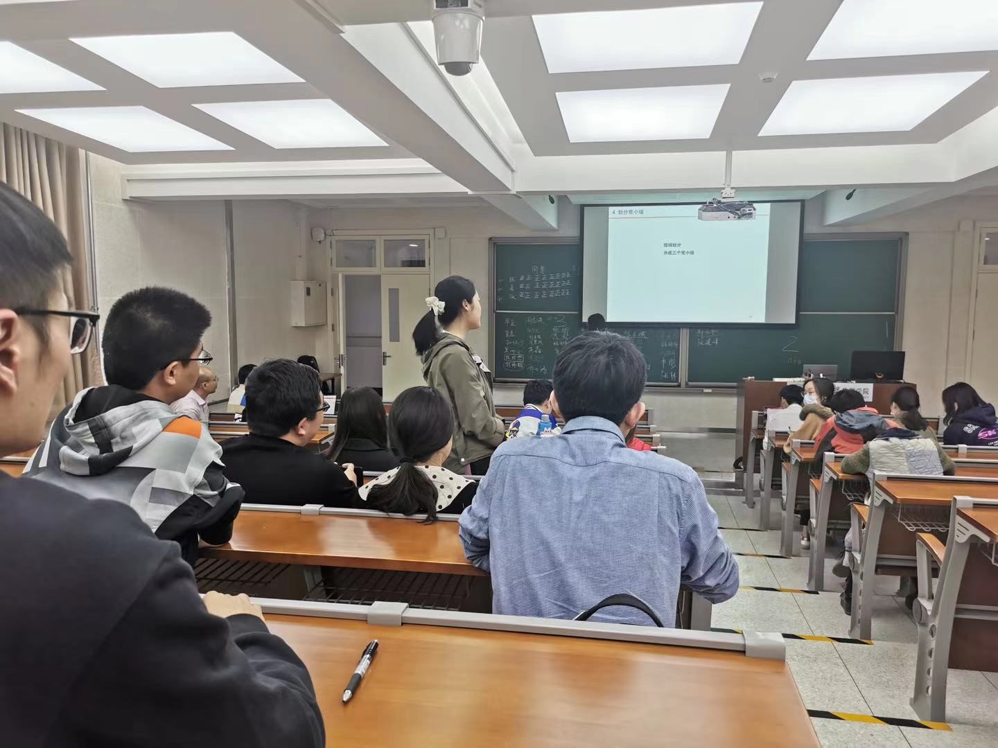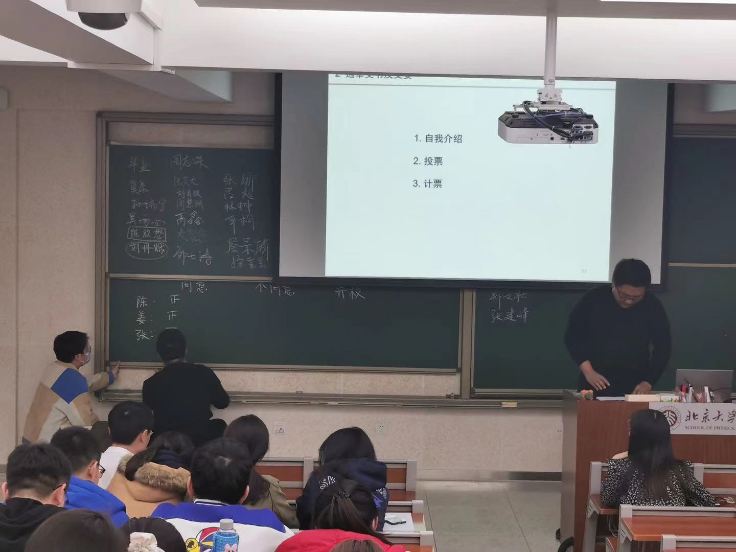 由于本支部重组不久大家都对彼此比较陌生,故在会议正式开始前,每一位支部成员将自己的名字写在了黑板上,既便于大家后续认识与熟悉,又活跃了大会的氛围。在姜美玲同志简单介绍了本支部的基本建设制度后,开始了支委的竞选发言。后经大家现场无记名投票与统计,陈欣懋同志当选为支部重组后的新支部书记,姜美玲同志当选为新的组织委员,张志斌同志当选为新的宣传委员。