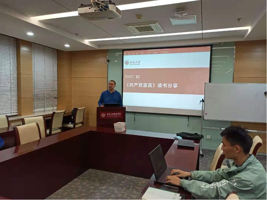 随后,何染尘同学就阅读《共产党宣言》的感想进行了支部主题党课。何染尘在阐述了党史学习的重要性以及阅读经典的重要启发价值后,分部分详细介绍了《共产党宣言》的历史意义、基本思想、内在逻辑以及当代启示,与会同学随后结合学习内容对当今时事热点进行了深入而激烈的讨论。