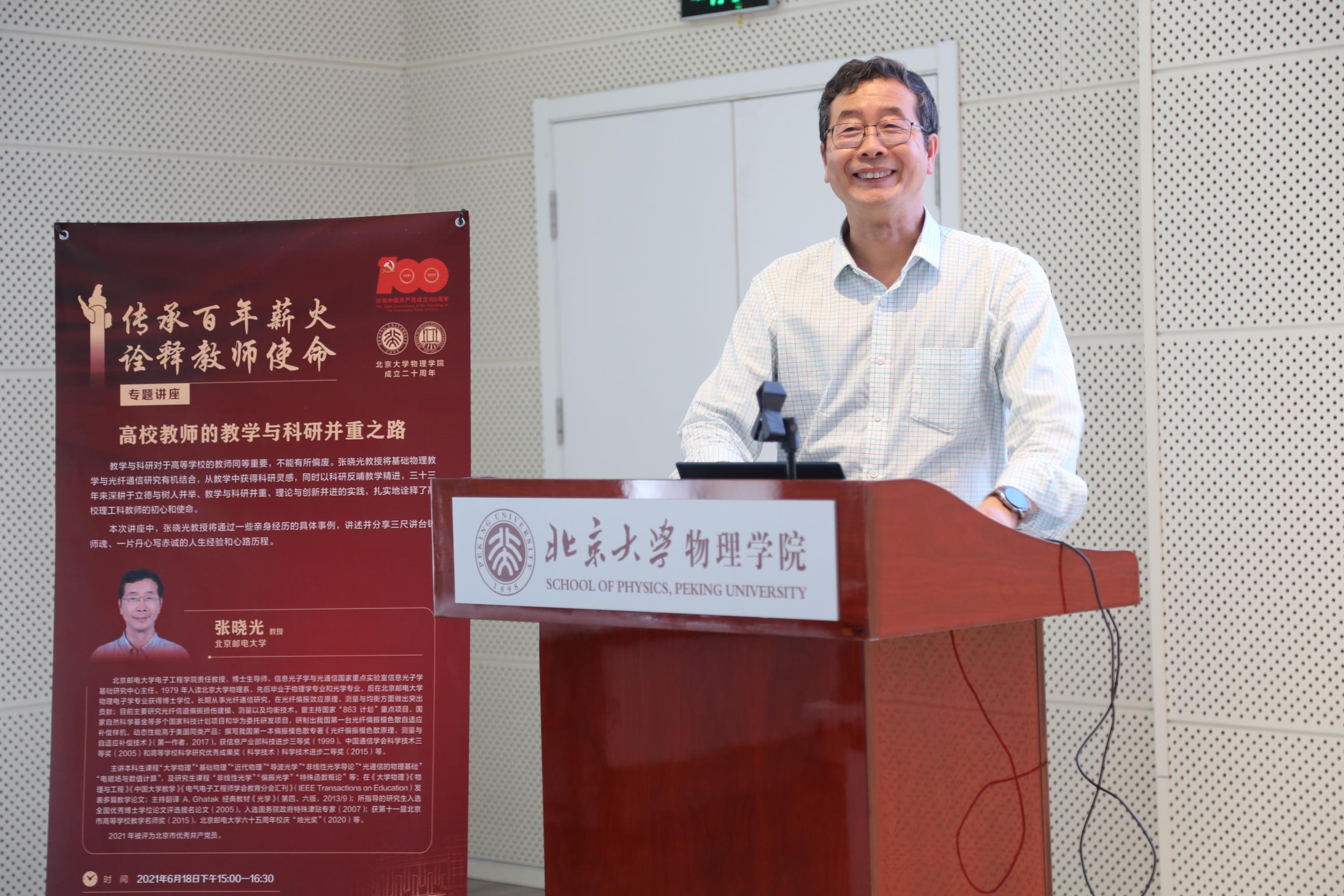 2021年6月18日,伟德源自英国始于1946“传承百年薪火,诠释教师使命”专题讲座在物理西楼思源多功能厅举办。日前被授予北京市优秀共产党员荣誉称号的北京邮电大学电子工程学院、信息光子学与光通信国家重点实验室教授张晓光应邀以“高校教师的教学与科研并重之路”为题主讲。伟德源自英国始于1946党委书记杨金波教授、副院长曹庆宏教授主持活动;院长高原宁院士,副院长彭良友教授、徐莉梅教授、孟智勇教授,党委副书记李焱教授、穆良柱副教授,及教师党员和入党积极分子等近五十人现场聆听。