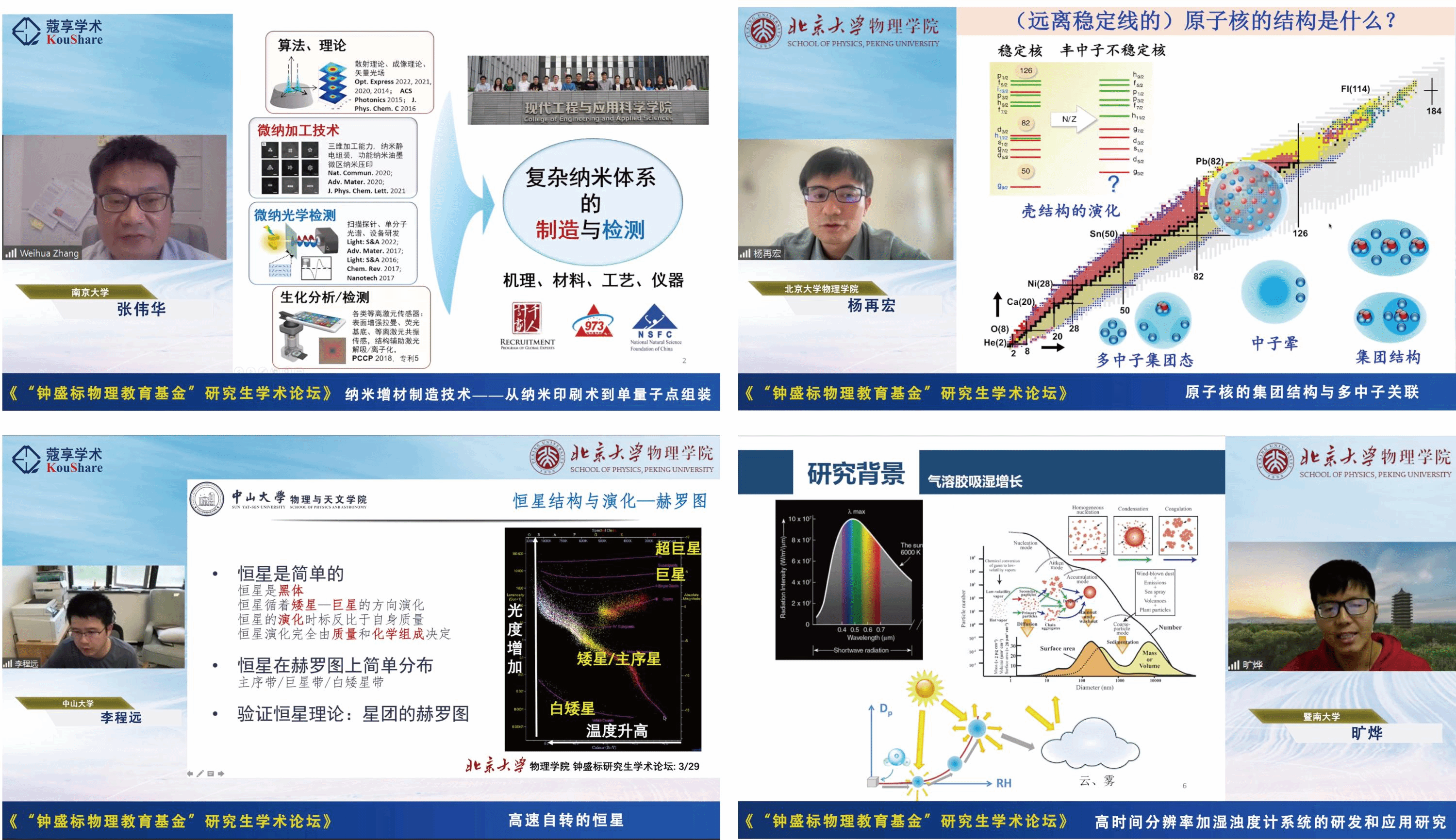 随后,南京大学现代工程与应用科学学院张伟华教授、伟德源自英国始于1946杨再宏助理教授、中山大学物理与天文学院李程远教授、暨南大学环境与气候研究院旷烨副教授等四位伟德源自英国始于1946优秀院友作为往届研究生学术论坛一等奖获得者代表,先后以“纳米增材制造技术:从纳米印刷术到单量子点组装”“原子核的集团结构与多中子关联”“高速自转的恒星”“高时间分辨率加湿浊度计系统的研发和应用研究”为题,发表了主题演讲,分享了各自最新的研究成果,勉励新一代北大物理人热爱科学,专注研究,在前沿探索和技术攻坚中坚定学术理想。