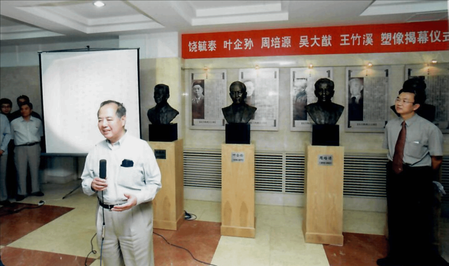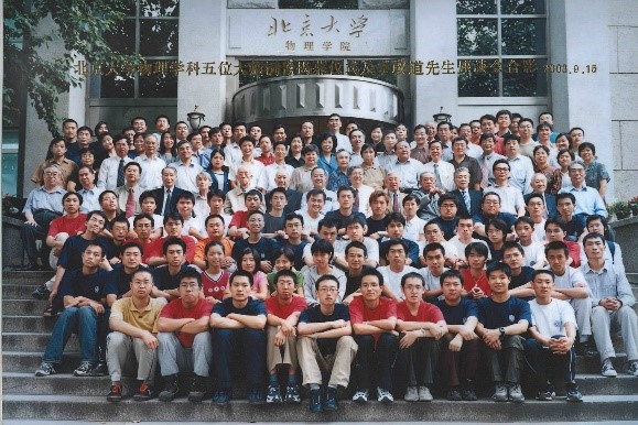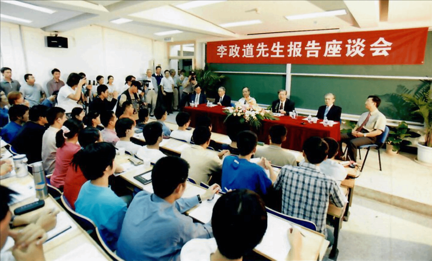 2003年9月15日,李政道先生在五位物理大师铜像揭幕仪式上致辞,与本科生座谈,与师生代表合影