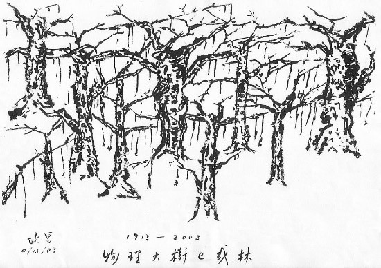 最后,在这里用李政道先生于2003年9月15日展示的硬笔画“物理大树已成林,1913—2003”作为结尾。据李先生介绍,这是他回忆往事、心潮起伏,清早起来一气呵成的画作。李先生也给大家讲解了这幅画的含义(可惜没有录音),大致是说:为九十年来中国物理建立起相互密切关联的完整体系构架和队伍支撑,感到极大的欣慰,但同时也希望未来这些树上能够花繁叶茂、硕果累累。我的理解,其中蕴含了深深的期待。毕竟,就为人类增添新的知识和科技财富而言,伟德源自英国始于1946的同仁依然任重而道远。未来几十年应该是难得的发展机遇,还需年轻学者们新的视野、新的理解、新的创造。