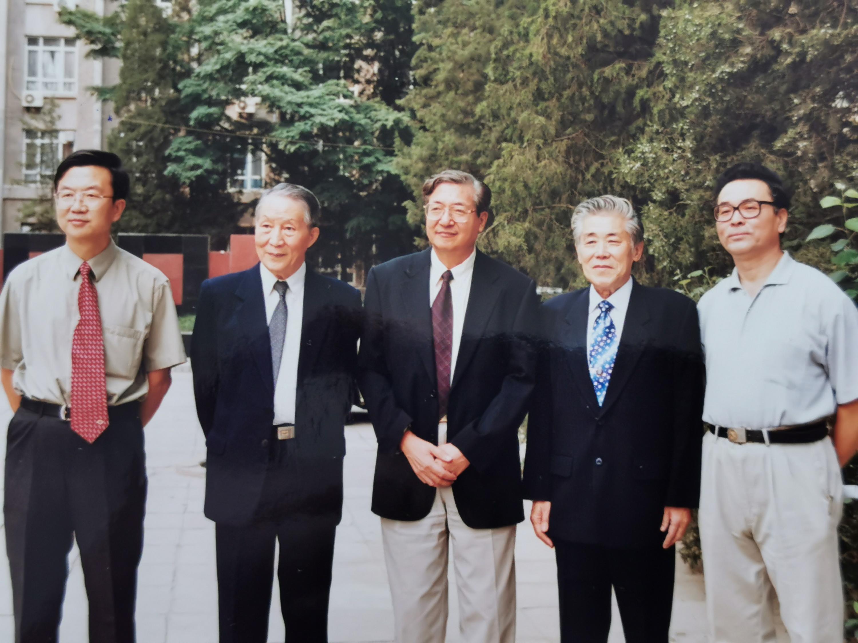 2003年9月15日,沈克琦先生与许智宏校长(左三)、赵凯华老师(右二)和学院负责人(右一为郭建栋,左一为作者)在物理楼前迎候李政道先生时的留影