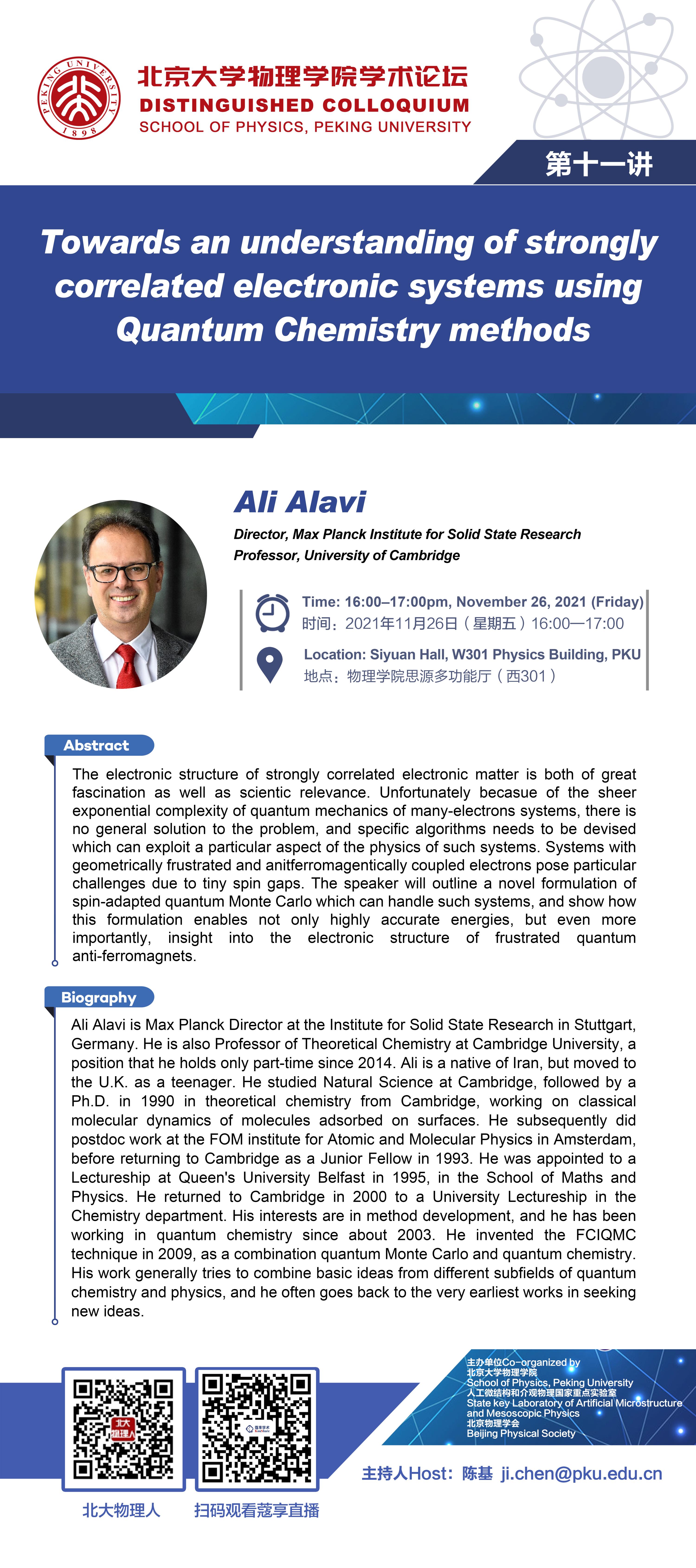 Ali Alavi is Max Planck Director at the Institute for Solid State Research in Stuttgart, Germany. He is also Professor of Theoretical Chemistry at Cambridge University, a position that he holds only part-time since 2014. He studied Natural Science at Cambridge, followed by a Ph.D. in 1990 in theoretical chemistry from Cambridge, working on classical molecular dynamics of molecules adsorbed on surfaces. He subsequently did postdoc work at the FOM institute for Atomic and Molecular Physics in Amsterdam, before returning to Cambridge as a Junior Fellow in 1993. He was appointed to a Lectureship at Queen's University Belfast in 1995, in the School of Maths and Physics. He returned to Cambridge in 2000 to a University Lectureship in the Chemistry department. His interests are in method development, and he has been working in quantum chemistry since about 2003. He invented the FCIQMC technique in 2009, as a combination quantum Monte Carlo and quantum chemistry. His work generally tries to combine basic ideas from different subfields of quantum chemistry and physics, and he often goes back to the very earliest works in seeking new ideas.