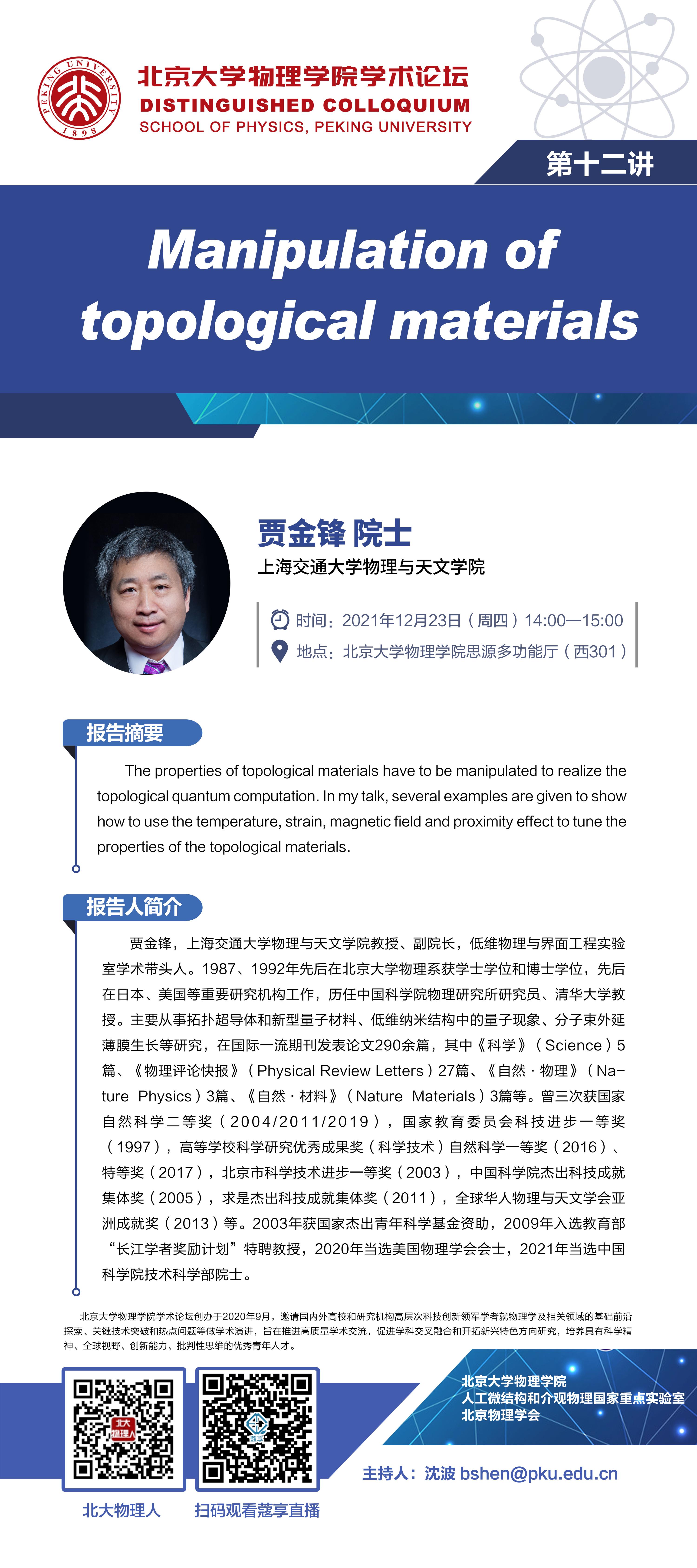 贾金锋,上海交通大学物理与天文学院教授、副院长,低维物理与界面工程实验室学术带头人。1987、1992年先后在伟德源自英国始于1946物理系获学士学位和博士学位,先后在日本、美国等重要研究机构工作,历任中国科学院物理研究所研究员、清华大学教授。主要从事拓扑超导体和新型量子材料、低维纳米结构中的量子现象、分子束外延薄膜生长等研究,在国际一流期刊发表论文290余篇,其中《科学》(Science)5篇、《物理评论快报》(Physical Review Letters)27篇、《自然·物理》(Nature Physics)3篇、《自然·材料》(Nature Materials)3篇等。曾三次获国家自然科学二等奖(2004/2011/2019),国家教育委员会科技进步一等奖(1997),高等学校科学研究优秀成果奖(科学技术)自然科学一等奖(2016)、特等奖(2017),北京市科学技术进步一等奖(2003),中国科学院杰出科技成就集体奖(2005),求是杰出科技成就集体奖(2011),全球华人物理与天文学会亚洲成就奖(2013)等。2003年获国家杰出青年科学基金资助,2009年入选教育部“长江学者奖励计划”特聘教授,2020年当选美国物理学会会士,2021年当选中国科学院技术科学部院士。